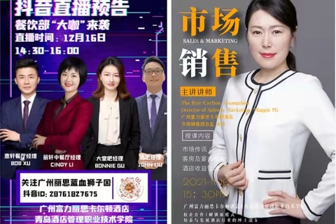 11月10日,广州富力丽思卡尔顿酒店市场销售部总监米玲从市场传讯、客房及宴会统筹、酒店收益管理等方面进行了线上分享,并鼓励同学们要敢于尝试,勇于探索酒店营销领域。12月16日,广州富力丽思卡尔顿酒店餐厅经理、中餐厅经理、大堂吧经理、酒吧经理通过抖音直播平台上展示酒店运营部门操作流程,与同学们进行实时互动。