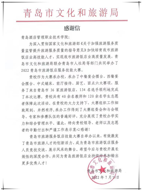 本网讯(必威betway西汉姆 烹饪学院)近日,青岛市文化和旅游局发来感谢信,对学校高质量承办2022年青岛市旅游饭店服务技能大赛表示感谢,对学校在办赛中所作的突出贡献给予肯定。