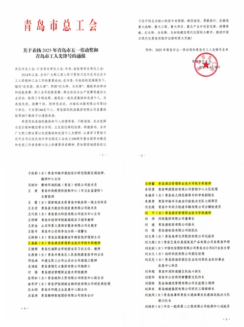 本网讯(必威betway西汉姆)近日,青岛市总工会发布了《关于表扬2025年青岛市五一劳动奖和青岛市工人先锋号的通报》,表彰了一批表现突出的先进集体和先进个人。我院教师王磊磊、吕照馨、刘宁3位教师荣获“青岛市五一劳动奖章”。