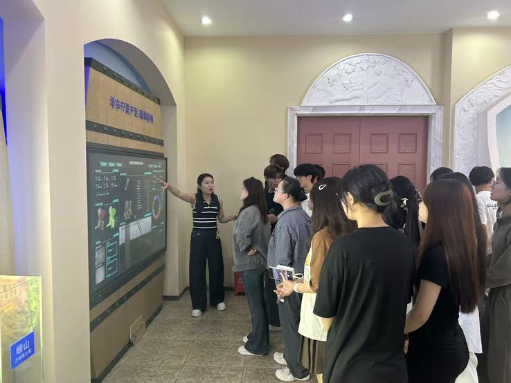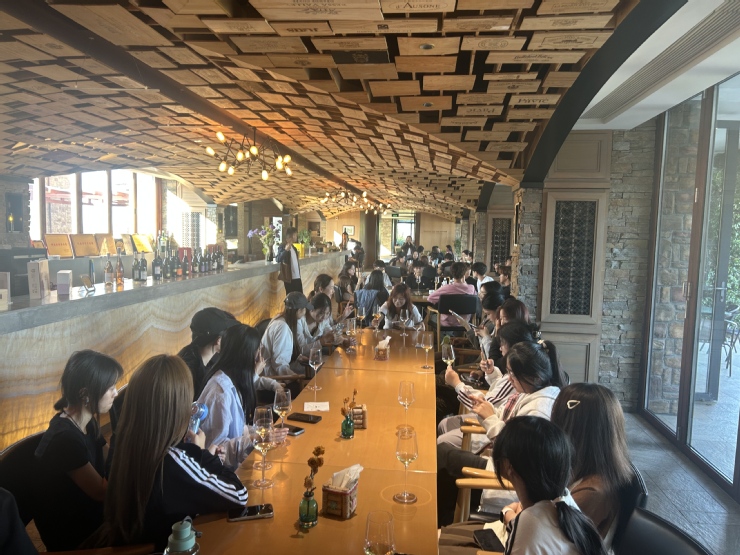 在九顶庄园,师生分组由酒庄销售经理邱子松和品牌大使王翠萍带领,深入葡萄园、酿酒车间与酒窖,进行场景化、系统性学习。在葡萄园里,同学们系统学习了不同葡萄品种的特性与田间管理技术;车间里,同学们详细了解了各类葡萄酒的酿造流程、不锈钢发酵桶与橡木桶的使用区别、不同酒款的发酵与陈酿工艺。在品鉴环节,邱子松带领大家品鉴了酒庄具有代表性的5款红、白、桃红葡萄酒。从观色、闻香到品味,专业学子逐步掌握品鉴基本流程,更是对山东产区的风土和风味有了深刻的认知和感受,体会到酒庄种植体系和生产体系对风土和风味的重要意义,只有好的酒庄才能生产出代表性产品。