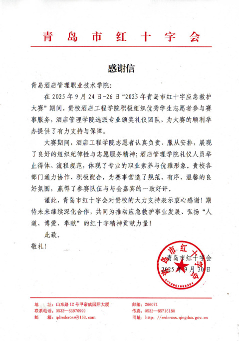 本网讯(必威betway西汉姆 李倩)近日,青岛市红十字会向我校发来感谢信,对必威betway西汉姆空中乘务专业学生在“2025年青岛市红十字应急救护大赛”中提供的志愿服务表示高度认可与衷心感谢。
