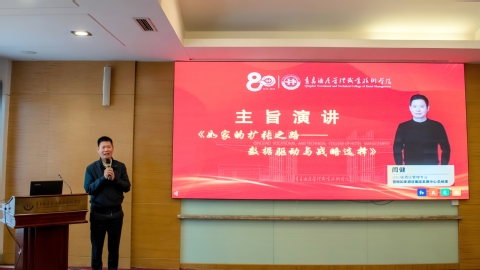 主旨演讲与圆桌对话环节聚焦行业前沿与职业发展。优秀校友、首旅如家酒店集团发展中心总经理闫健以《如家的扩张之路:数据驱动与战略选择》为题,分享酒店行业创新实践;在围绕“专业跨界”“职业能力跃迁”等议题的圆桌对话中,青龙美爵酒店总经理史兴伟、乔治莫兰迪酒店城区经理赵和、淄博张店潘南印巷餐厅创始人杨锋3位优秀校友与主持人、青岛融海耀洲酒店业主总经理李晓庆展开深入交流,为在校生与青年教师提供了宝贵经验。